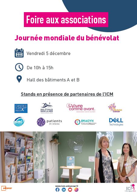 À l’occasion de la Journée Mondiale du Bénévolat, l’ICM organise une foire aux associations le vendredi 5 décembre, de 10h à 15h, dans le hall des bâtiments A et B.